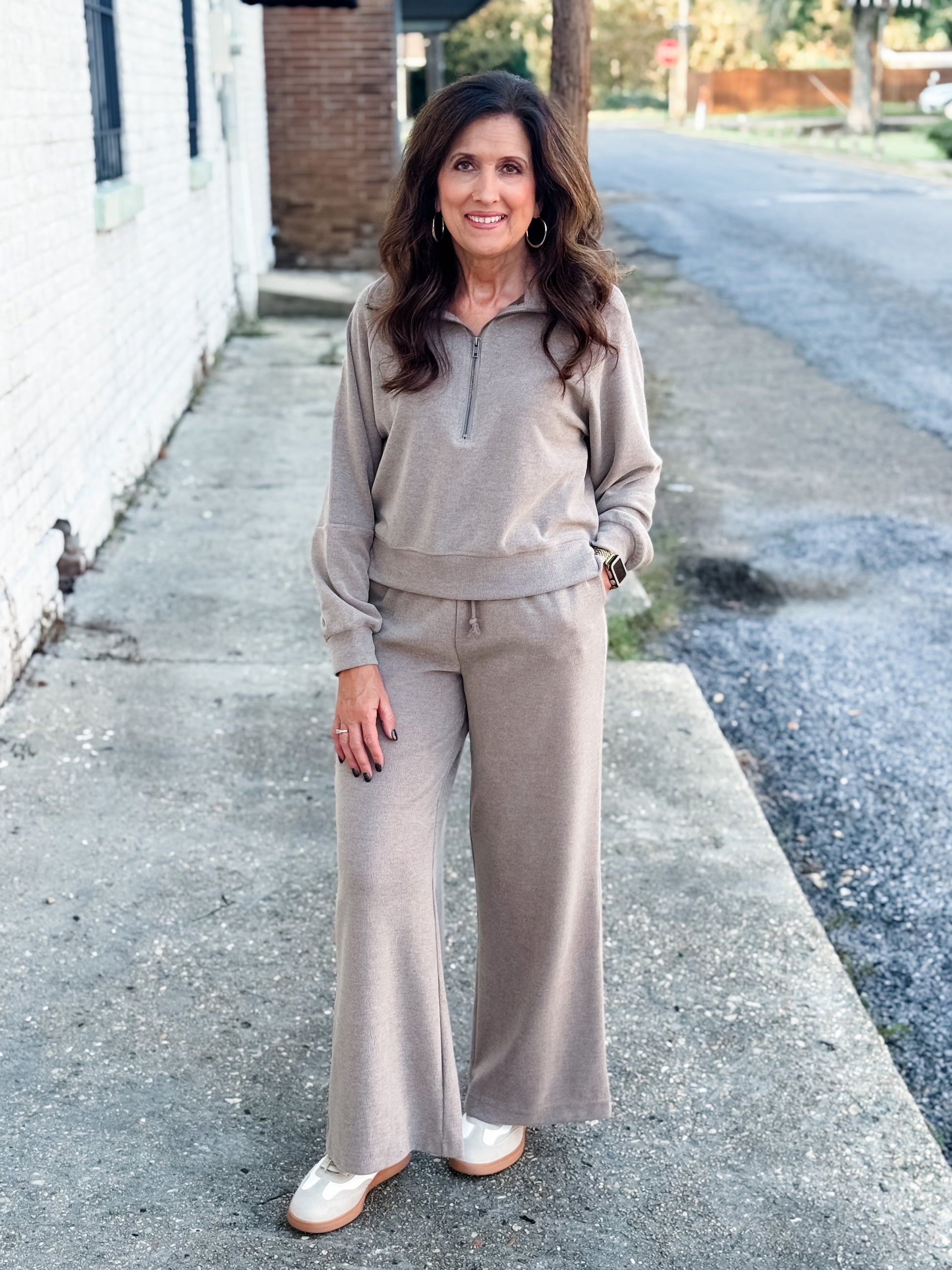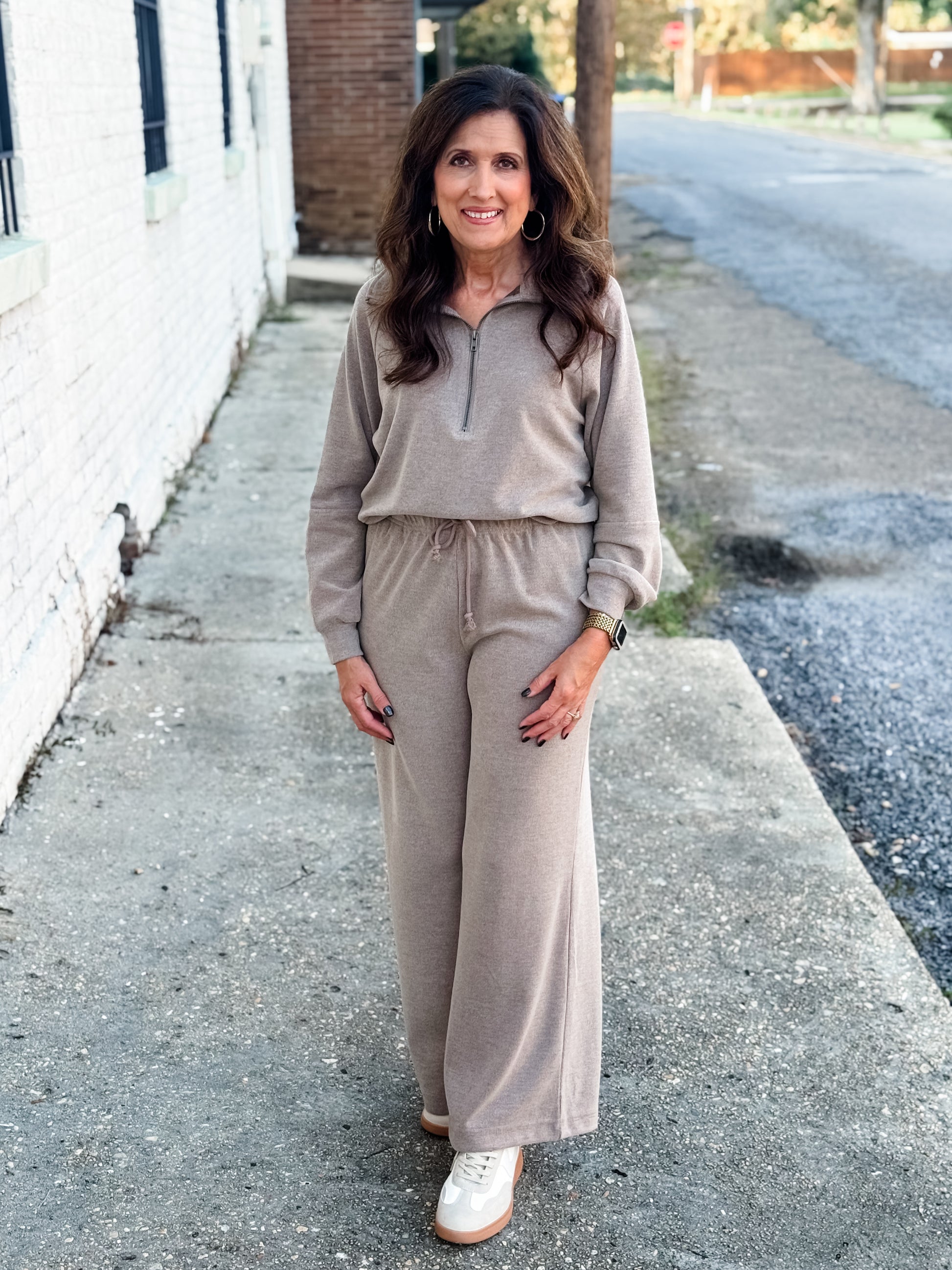 Get ready to conquer the day in our Back Me Up Set! This stylish set features a quarter zip, wide leg pants, and a versatile neutral color. Perfect for any occasion, it's also incredibly comfy. You'll feel supported and ready to take on anything with this set on your side.