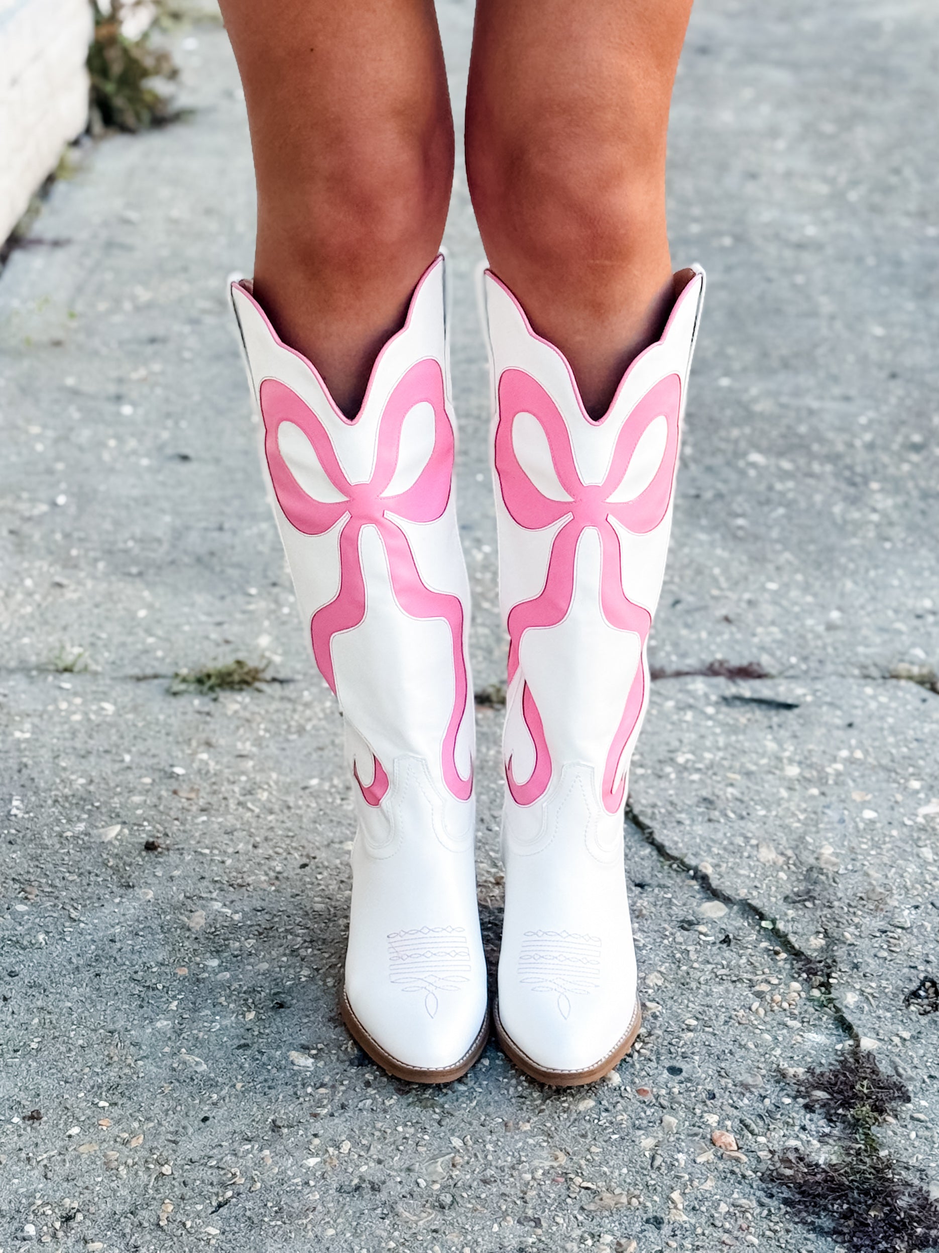 These whimsical cowgirl boots combine traditional charm with a playful twist. Adorned with a pink bow on classic white boots, they're perfect for adding a pop of color to any outfit. Let your inner cowgirl shine in style with these Dime Store Cowgirl Boots! Running true to size.