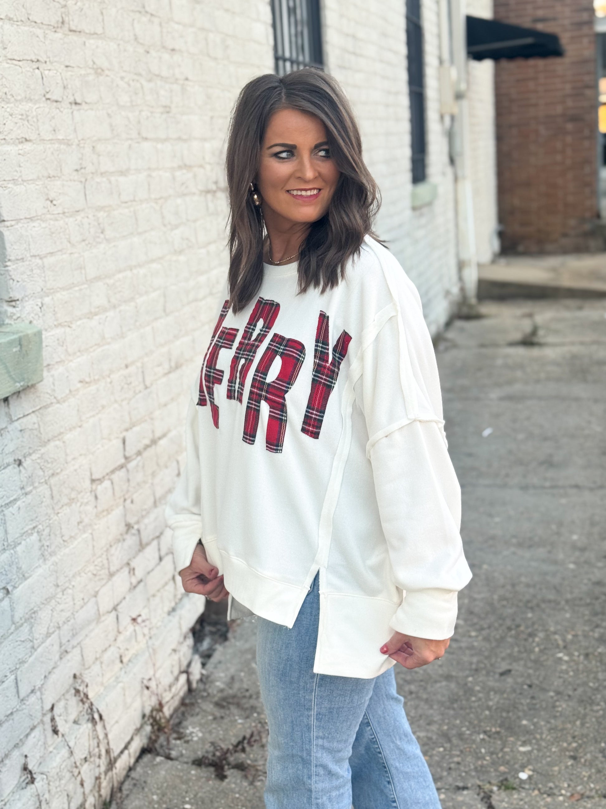 Get cozy in our Merry Holidays Pullover! This oversized white top features a festive "Merry" in plaid across the front, perfect for spreading holiday cheer. You'll stay warm and stylish all season long.